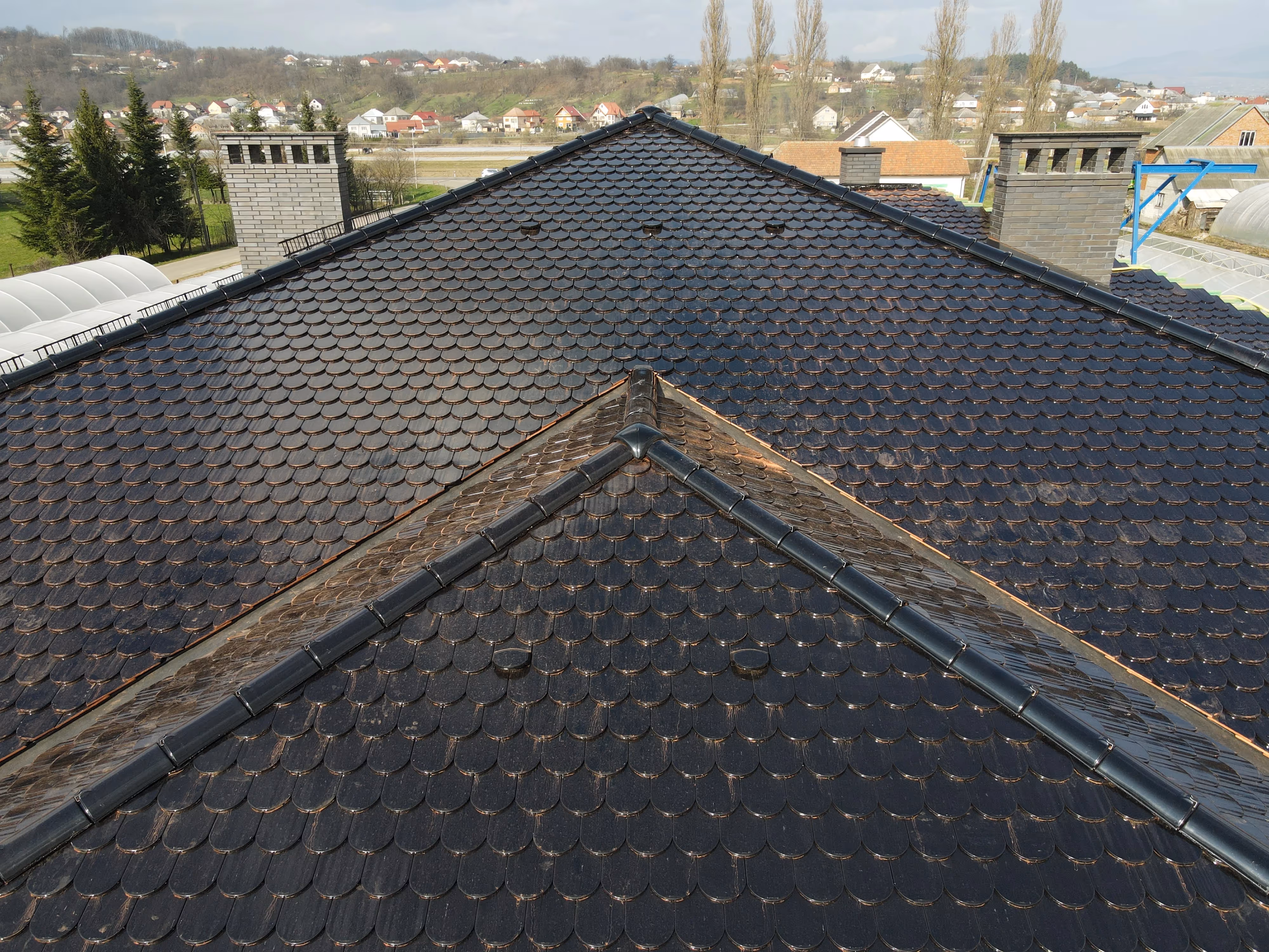 У селі Заріччя ми реалізували проєкт покриття даху керамічною черепицею Creaton KLASSIK із закругленою формою типу ROG. Вишукане глазуроване покриття FINESSE чорного кольору надає покрівлі естетичну глибину та виразність, поєднуючи класичний вигляд із сучасною якістю. Така черепиця не тільки прикрашає будинок, але й забезпечує довговічність та надійність навіть за складних погодних умов.